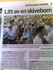 Det er avisens høyst kompetente og meget anerkjente musikk-anmelder Bodvar Lotsberg som treffer innertier med sin kommentar ”Litt av en skivebom” i onsdagens utgave. Han er skuffet og mener det er ”en stor ripe i lakken til de som har regien” at Elverum Mannskor ikke skal synge den kjære bysangen sammen med Festspill-publikummet og Ungdomssymfonikerne. Musikkjenneren og ordkunstneren Bodvar Lotsberg mener det er helt uforklarlig at Elverumssangen ikke skal avsynges under kveldens åpningskonsert. – Dette har vært kjent lenge og vi har tidligere uttrykt vantro over Festspill-ledelsens valg. Men vi har fått forsikringer om at fra neste år av vil alt være som før igjen. Med aktiv og selvsagt deltakelse fra Elverum Mannskor, sier en glassklar og uvanlig godt opplagt president og 1.tenor i det på stadig flere og flere måter veldige mannskoret med de velsittende og skreddersydde jakkene i den nærmest vemodig vakre burgunderrøde fargen, Einar Mellum.