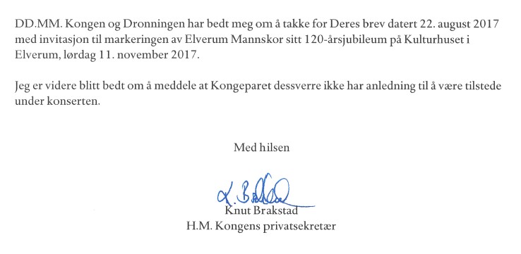 Brevet som forteller at kongeparet ikke har anledning til å delta på jubileumsforestillingen til Elverum Mannskor.