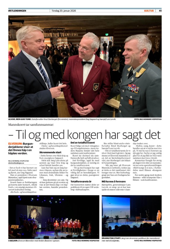 – Vi ønsket å vise at Elverum Mannskor er en viktig del av vårt lands totalforsvar. Med statsforvalter Knut Storberget og hærsjef Lars Lervik på plass, tror jeg vi fikk øynene opp for at kultur og skikkelig kulturformidling er egnet for å skjerpe beredskapen vår, sa den veltalende og bestandig svært treffende president Søgaard etter at teppet hadde gått ned fredag kveld.