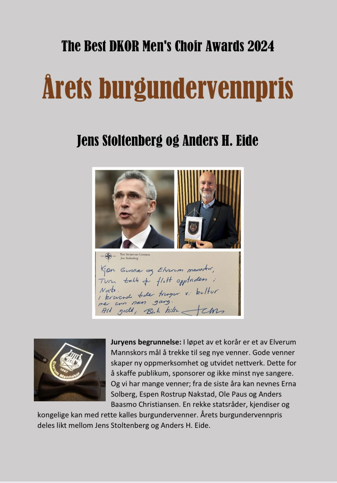 – Som en del av totalforsvaret og med et sterkt samfunnsengasjement, mener vi det er på plass at et kor på vår størrelse tar ansvar for å heve kunnskapen og bevisstheten rundt fred og beredskap. Begreper som er aktuelle i en urolig verden, avgjørende for forsvars- og beredskapshovedstaden Elverum og viktige for Elverum Mannskor som en del av vår totalberedskap, sier presidenten for det på mange måter veldige mannskoret.