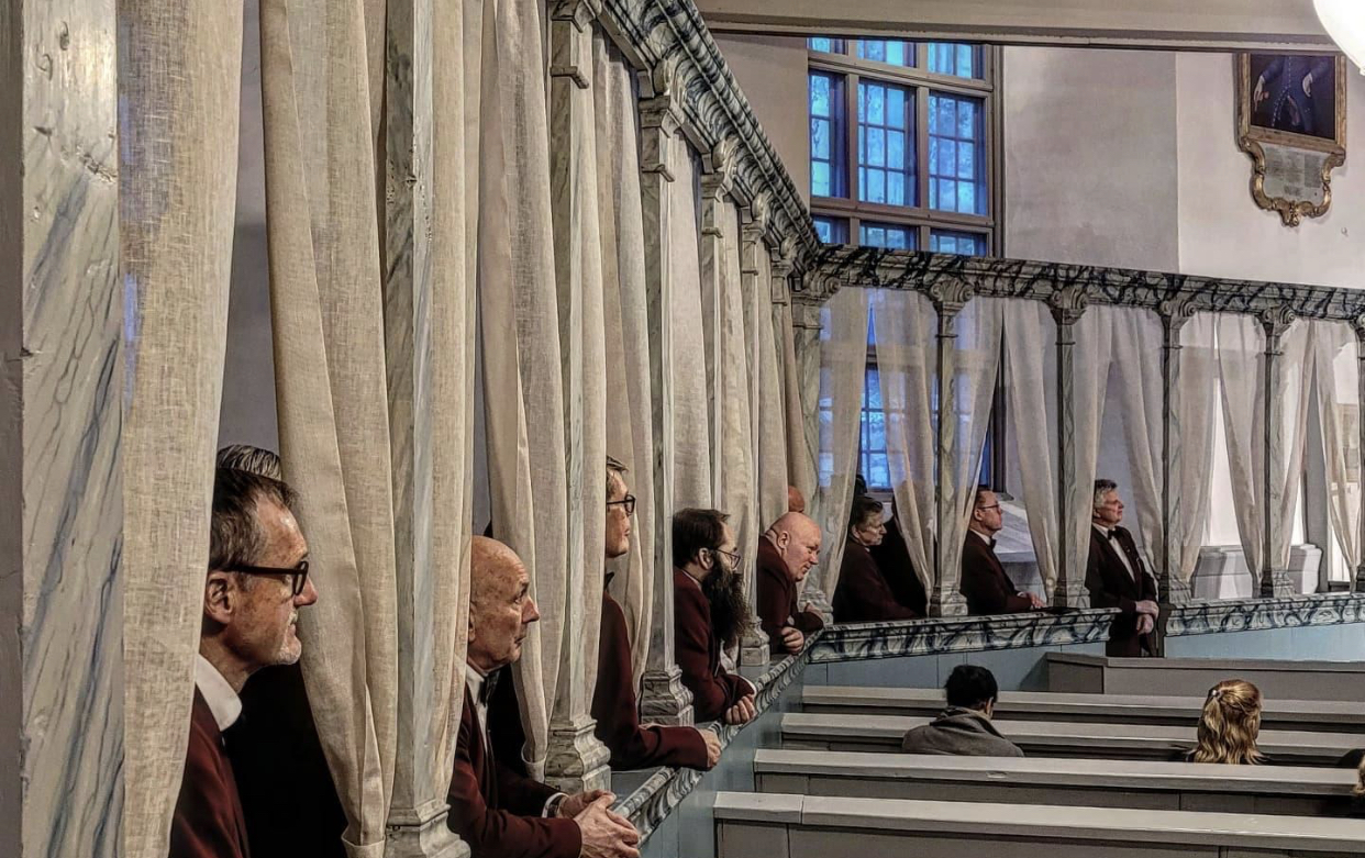 2.tenorer synger i Røroskirke. Ikke så rart noen hadde hengt opp et bilde av den lokale helten Peder Hiort da han er så korrekt antrukket.