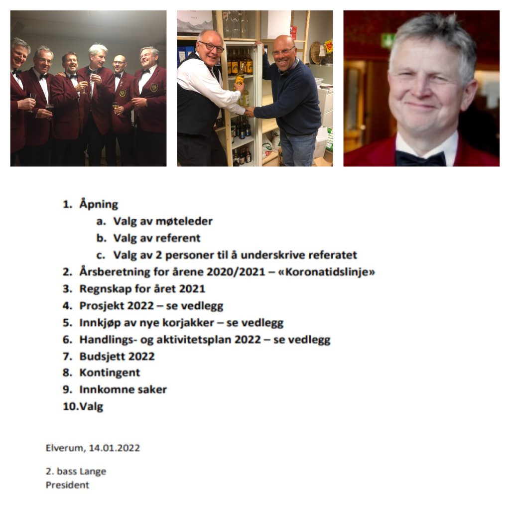 Øverst til venstre presidentskapet som etter alt å dømme vil fortsette uforandret, videre tyder alt på at materiell- og lageransvarlige 1. bassene Pedersen og Spjeldnæs får mer å gjøre enn å stable akevitt og til høyre 2. tenor Bjøntegaard som holder stø kommunikasjonskurs før årsmøtet. Under er årsmøtets saksliste.