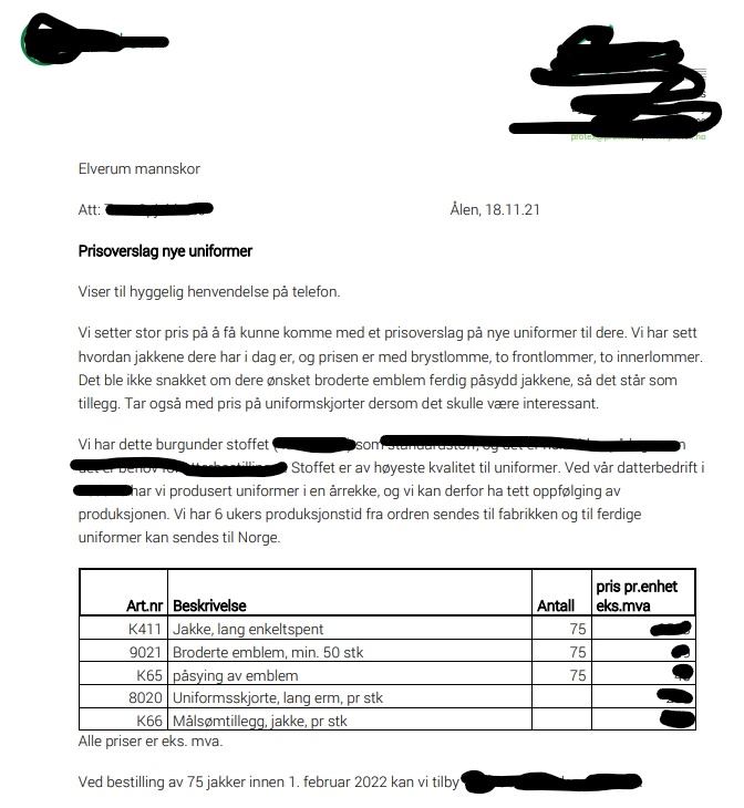 Fra anonyme tipsere har Burgunder-Nytt fått tilgang til et dokument som viser at Elverum Mannskor er i ferd med å innhente priser på noe som tilbyder først kaller «uniformer». Siden kommer det fram at det er snakk om en bestilling på 75 jakker med brystlomme, to frontlommer og to innerlommer. Jakkene er type lang og enkeltspent.