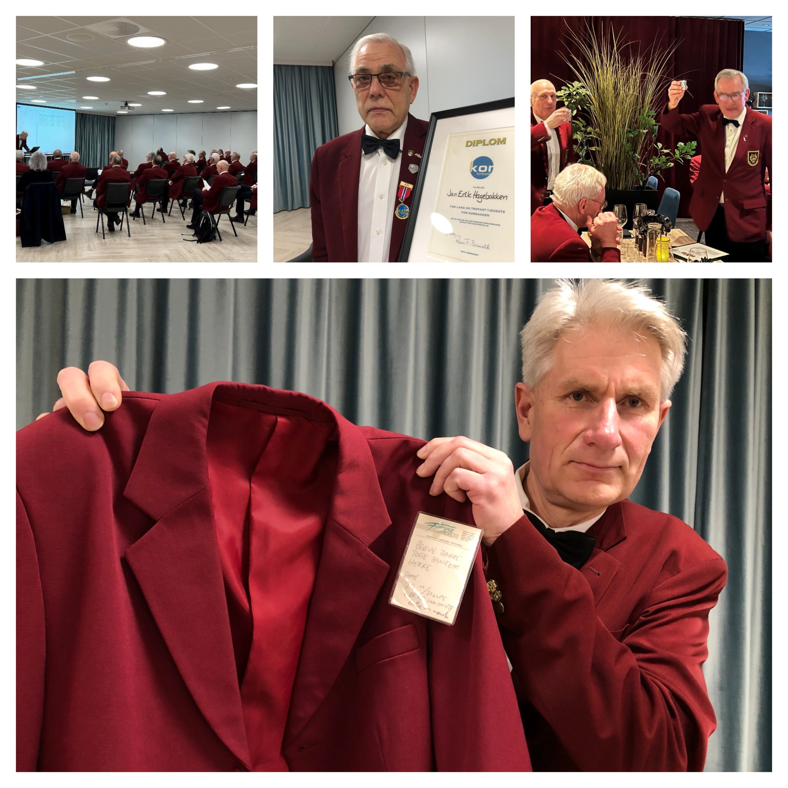 Årsmøtet fikk en hyggeligst mulig avslutning da presidentskapsmedlem 2.tenor Bjøntegaard overraskende tok ordet og ba den svært høyt dekorerte og helt uvanlig aktede 2.bass Hagebakken om å komme fram. Etter vakre ord mottok den lojale og burgunderglade bassen sin diplom for 40 års virke i korbevegelsen. Etter noen fikling med spisse nåler, fikk medaljen også sin plass på den stolte veteranens korjakke. Applausen var selvsagt stående. .