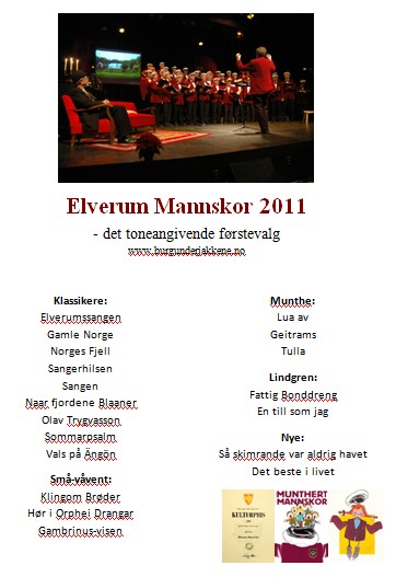 De offisielle og i virkeligheten eneste leverandørene av ”Elverumssangen” og de kongelige hoffleverandørene av ”Gamle Norge”, koret med den internasjonalt anerkjente grunntonen og den lokalt høyt beskattede klangen, befester på mange måter med denne listen over sanger sin posisjon som innovative tradisjonsbærere. Klassisk mannskorsang og kultur forenes med det mer moderne på til nå helt ukjente måter. – Ja. Det er bare slik vi både er i stand til å drive mannskorsangen videre til nye generasjoner på og å løfte fram opprinnelsen og grunnverdiene i mannskorbevegelsen. Med vår målbart økende innflytelse og anerkjennelse, føles dette som en stadig viktig dimensjon i vårt korpolitiske og ikke minst korstrategiske arbeid, avslutter visepresidenten.