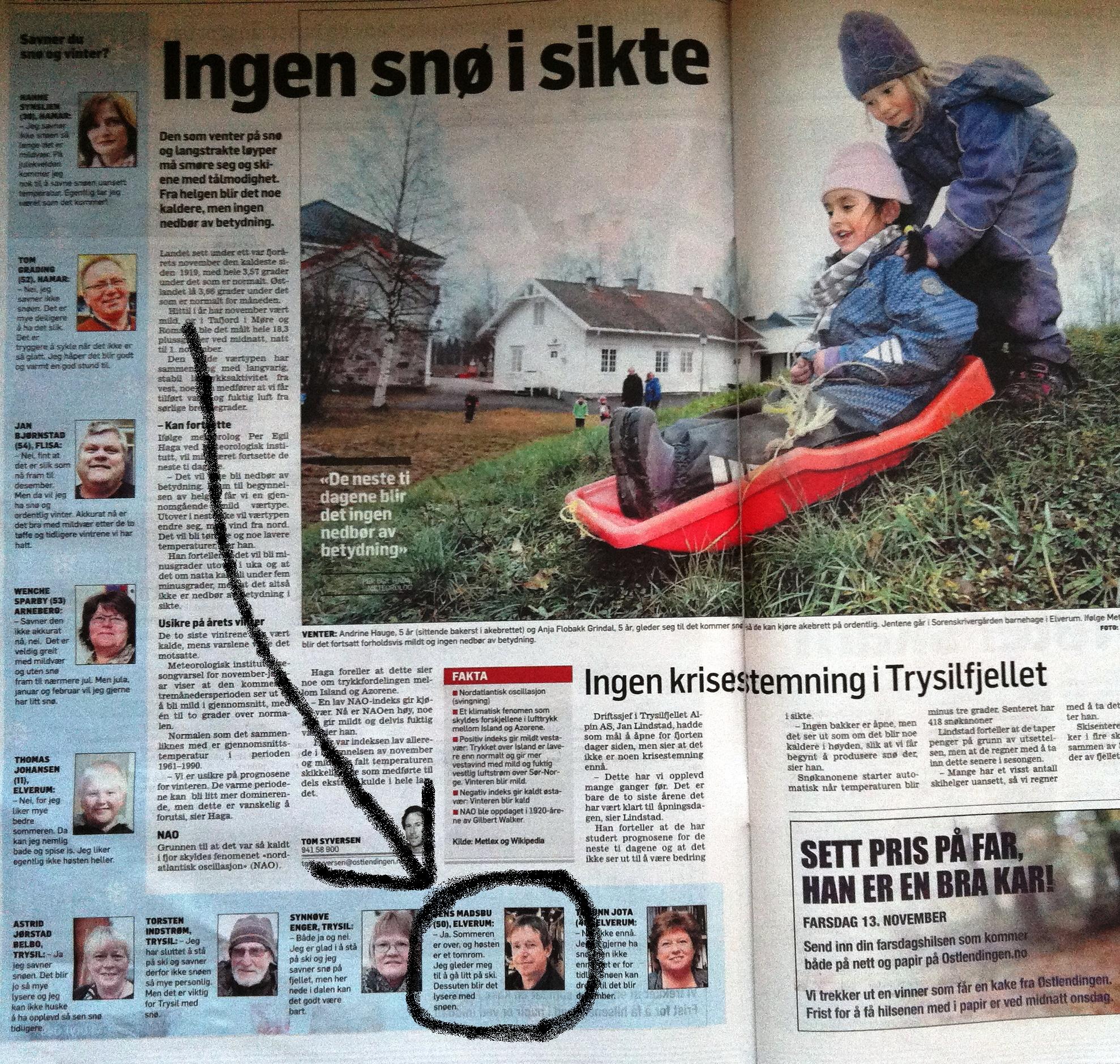 Følg den sorte pilen og finn Madsbus sentrale plass i det rikt illustrerte oppslaget om lengselen etter vinter og snø i lokalavisa Østlendingen tirsdag.