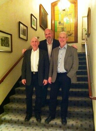 En strålende opplagt trio fra Elverum Mannskor på tur i Karlstad. President Einar Mellum (t.v), visepresident Gunnar Østmoe og presidentbror Rolf Mellum. Legg merke til at hotellet for anledningen hadde rullet ut tepper med påtrykte "E"-er. "E" som i Elverum Mannskor.