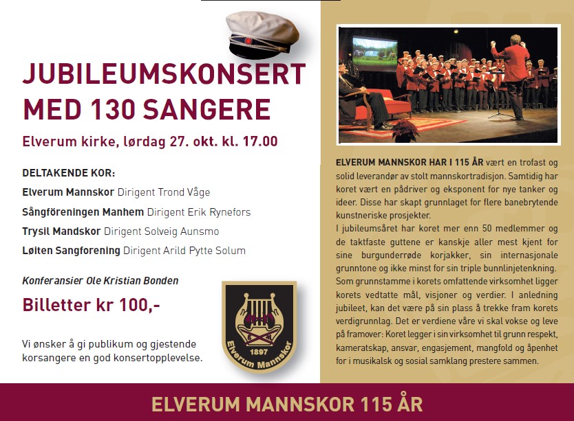 – Over 130 mannskorsangere skal levere fra øverste hylle under konserten i Elverum kirke og over 200 gjester samles til en gedigen jubileumsfest i rådhusets festsal lørdag kveld. Dette er noe vi har forberedt og gledet oss til lenge, sier en svært feststemt president, den alltid like veltalende og presise 1. tenoren med den glassklare røsten og den kameratslige omgangstonen, Einar Mellum. Han forteller at mannskor fra Karlstad, Løten og Trysil gjester burgunderjakkene på jubileumslørdagen. Kirkekonserten står i mannskortradisjonens tegn og en mengde klassikere vil bli framført. Konserten starter klokken 17.00 og er selvsagt åpen for publikum. Jubileumskonserten vil bli ledet av Elverums egen sokneprest, Ole Kristian Bonden.
