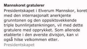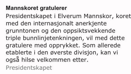 – Vi har store forventninger både til egne prestasjoner og selvsagt til våre gjesters. Hvert kor vil ha sin egen avdeling og i tillegg blir det uforglemmelige fellesnumre. Vi har, gjennom konserten, rett og slett et håp om å vise fram noe av hva som bor av kvalitet i mannskorbevegelsen. Selvsagt har vi også store forventninger til jubileumsfesten med både mannskorgjester og andre prominente gjester fra det offisielle Norge, sier presidenten for de jubilerende kulturkjæledeggeneog de kongelige hoffleverandørene av “Gamle Norge” samt de offisielle og i realiteten eneste leverandørene av “Elverumssangen” fra landets skoghovedstad. Han avslutter med at bare lederen av Norges Korforbund og kongens sendemann i Hedmark, fylkesmannnen, har takket nei til invitasjonen om å delta på jubileumsfesten. Som vanlig er president Mellum tilbakeholden med den offisielle gjestelisten.