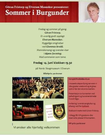 Stedet er Norsk Skogmuseum og datoen er 14.juni. Elverum Mannskor, koret med den internasjonalt anerkjente grunntonen og de velsittende og helt åpenbart skreddersydde korjakkene med den opp mot vemodig vakre burgunderrøde fargen, har engasjert den svenske viselegenden Göran Fristorp og ønsker velkommen til en storslått koropplevelse.