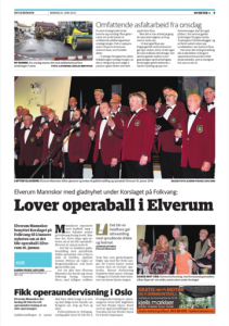 – Vi opplevde først et unisont gisp, så kjente jeg en intens forventning og endelig en ellevill glede fra både det tallrike publikum og fra medlemmene i byens andre kor da Østmoe lot ordene om den opp mot sensasjonelle operasatsinga vår falle. Og vi kunne levere en aldri så liten smaksprøve også. Aldri har nok «Jegerkor» blitt framført på en mer overbevisende måte av et mannskor fra Elverum, sa en svært stolt og beveget president for det nesten bestandig CD-aktuelle og svært høyt dekorerte koret med de velsittende og helt åpenbart skreddersydde korjakkene i den opp mot vemodig vakre burgunderrøde fargen, den alltid like korrekte, veltalende og tilstedeværende 1. bass, Jan Eirik Krey.