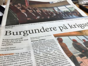 Ellers sier presidenten at det er like artig hver gang pressen treffer i sine omtaler av burgunderjakkene og korets veldige og omfattende virksomhet. Han viser til ukeavisa iElverums rikt illustrerte oppslag torsdag. Tittelen “Burgundere på krigsstien” har en dyp, god og dobbel bunn, mener Krey.