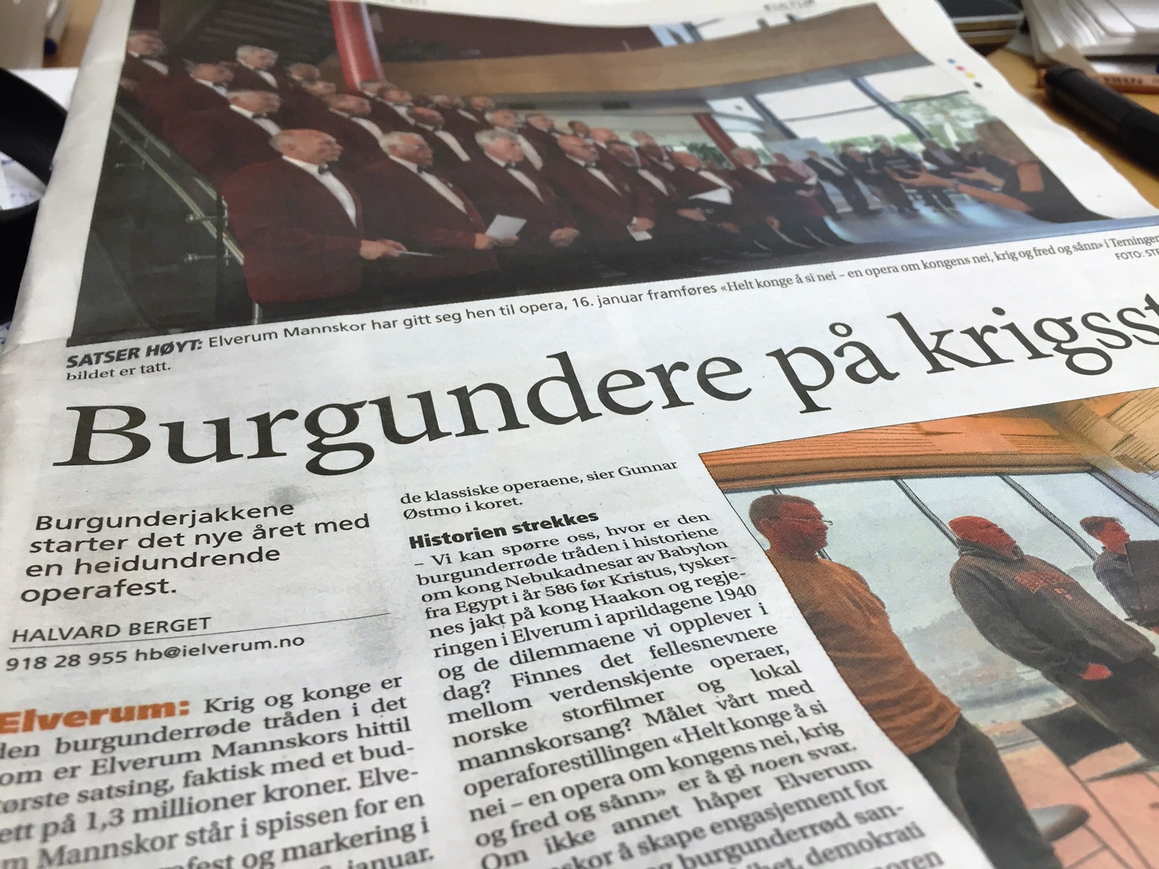 – Det er rett og slett en journalistisk innertier, sier en smørblid president for det på mange måter veldige koret. Han oppfordrer til slutt publikum om ikke å vente for lenge med å sikre seg billetter til “Helt konge å si nei – en opera om kongens nei, krig og fred og sånn”.