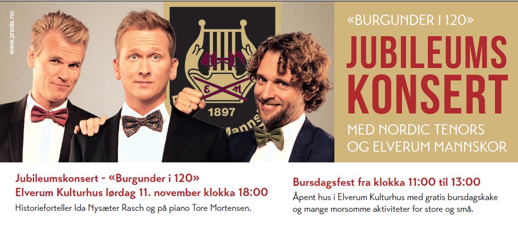 Jubileet fortsetter med konserten Burgunder i 120 klokka 18.00 i Storstua. Elverum Mannskor og de nasjonale korheltene Nordic Tenors står på scenen. Elverums egen Ida Nysæter Rasch er historieforteller og operapianist Tore Mortensen blir å finne på piano. Billetter er lagt ut her.