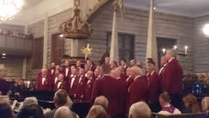 Som vanlig møtte de burgunderrøde kulturambassadørene en fullsatt kirke, da de entret korkrakkene og åpnet med den forhåndsannonserte Nordnorsk julesalme. En sikker publikumsvinner. Så leverte koret med den internasjonalt oppsiktsvekkende triple bunnlinjetenkningen overraskende nok den svenske Koppången. Urframførelse fra mannskor tilhørende Elverum med burgunderrøde jakker av et svært krevende verk. Juletårene i publikums øyekroker var tydelig etter hvert som de veldige satsene fylte kirkerommet. Sterkt, mente noen. Magisk, andre.