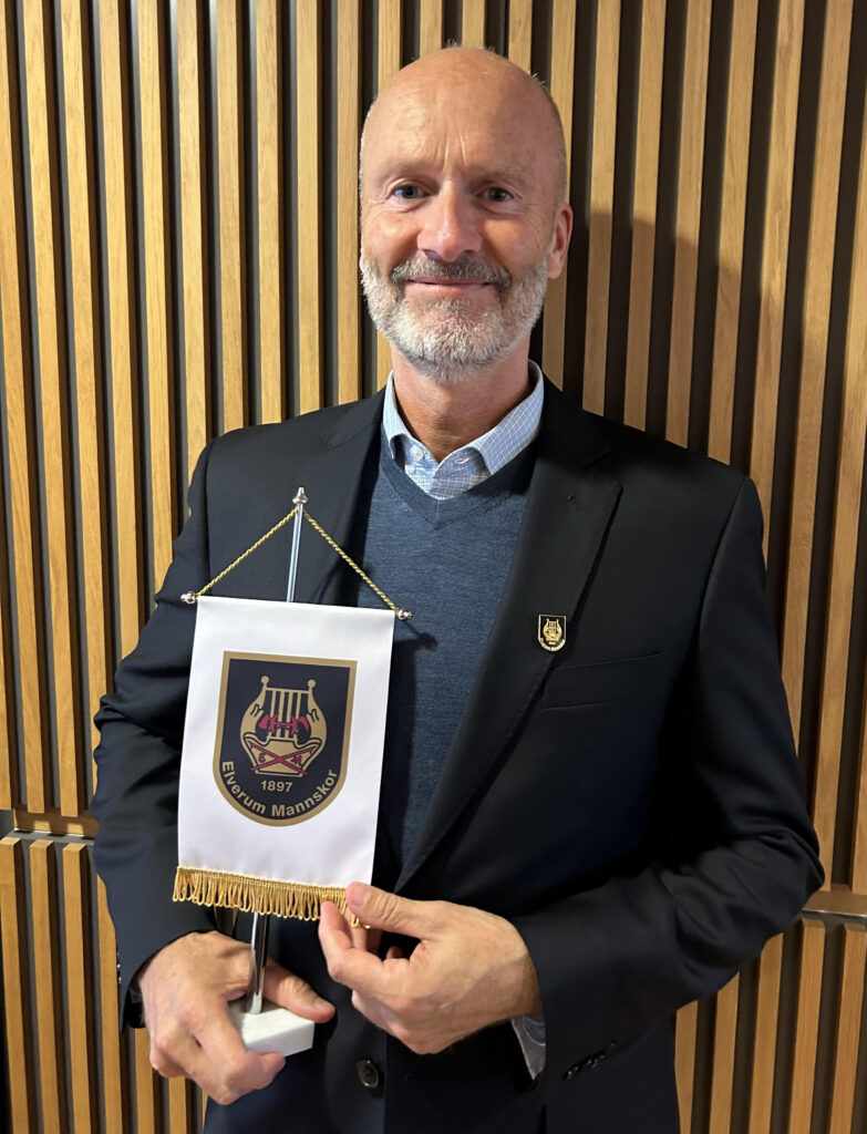 Elverum Mannskor har mottatt takk fra ambassadør Eide i Brussel. Stolt viser ambassadøren fram korets vimpel. Legg også merke til at toppdiplomaten har korets pin korrekt plassert på jakka.