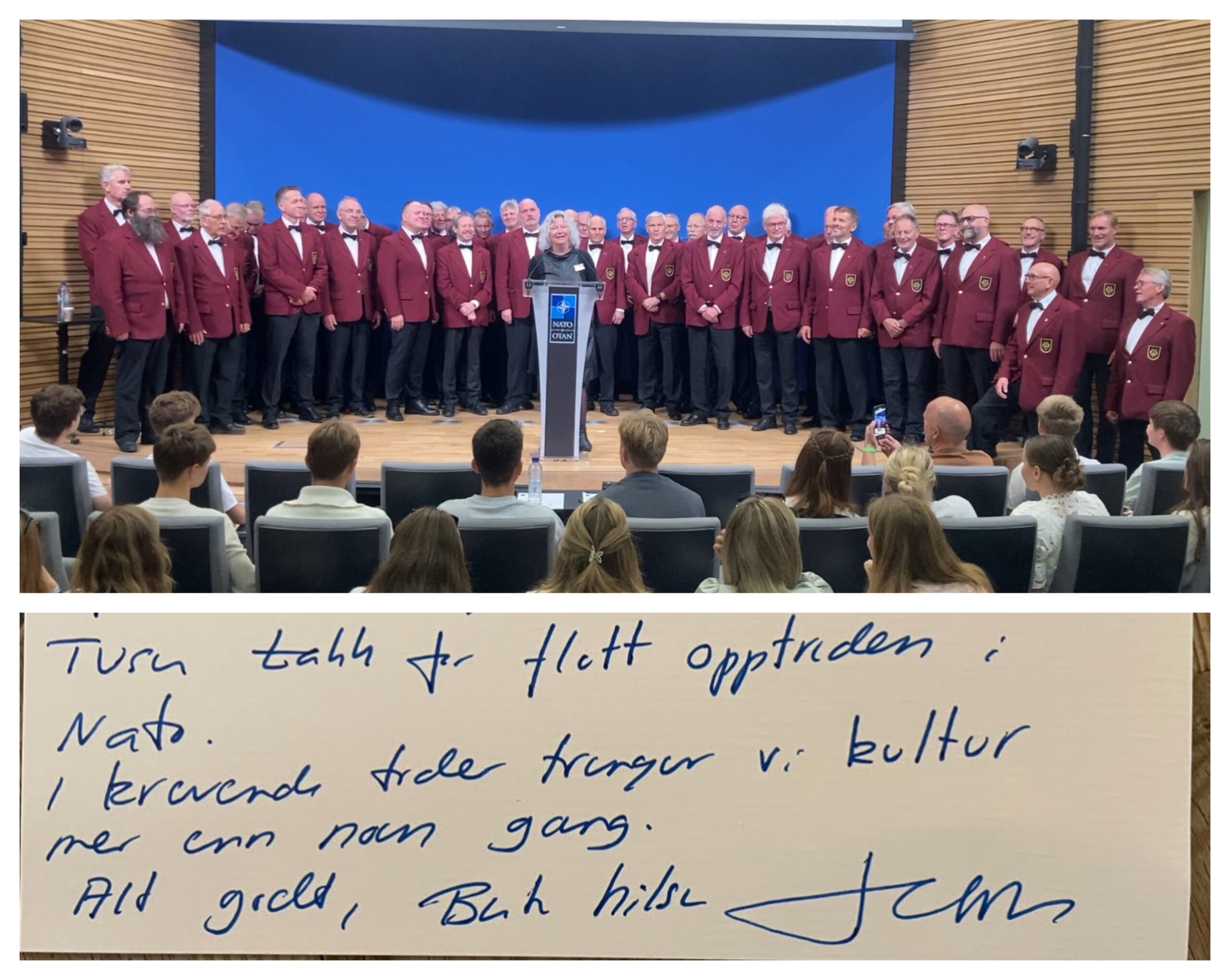 Presidenten forteller at korets framførelse i NATOS pressesenter ble videofilmet og vist til generalsekretær Stoltenberg og frue samme kveld. Foreløpige meldinger går på at videoen både falt i smak og var av betydning.