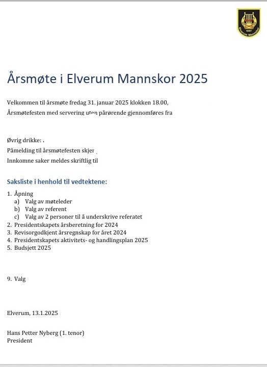 SLADDET: Her er innkallingen til årsmøteforhandlingene i Elverum Mannskor.